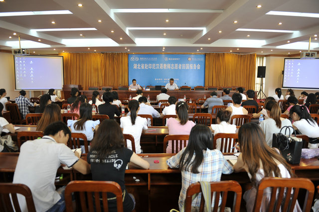 本网讯(记者陈戈)“志愿者很平凡,但他们都像美丽天使,都有一双隐形的翅膀。”6月27日上午,2011年湖北省赴印尼汉语教师志愿者归国报告会在我校光谷校区5号会议室召开,副校长李建勇致辞,校长助理曹曼,省教育厅对外合作与交流处施维科长,华中科技大学、湖北工业大学及我校相关部门负责人出席,刚从印尼回国的9名汉语教师志愿者和100余名在校生参加。我校国际交流合作处处长乐三明主持报告会。