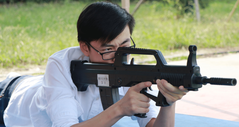 身体趴在垫子上,双脚撇开,身体右侧与枪身成一线。体验学生将枪托抵在肩窝,左手握弹夹,右手食指前段预压扳机,当瞄准线指向瞄准点时,右手迅速扣压扳机。学校狼牙精英连指导老师李祖平与教官们仔细查看体验学生的射击姿势,对于枪托不抵实等问题进行一一纠正。