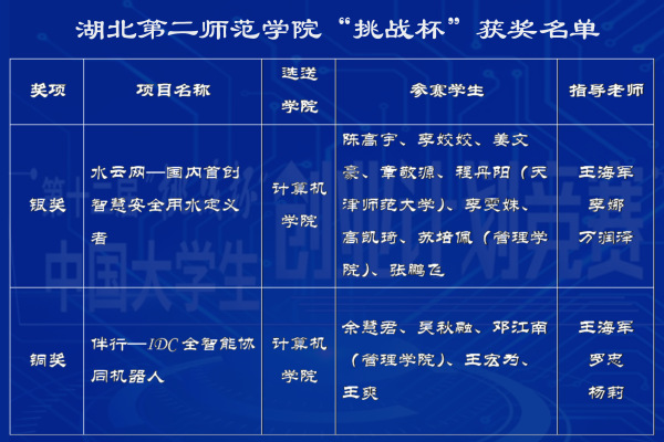 《水云网—国内首创智慧安全用水定义者》项目由王海军、李娜、万润泽等老师指导,陈高宇、李姣姣、程丹阳等学生参与。《伴行—IDC全智能协同机器人》项目由王海军、罗忠、杨莉等老师指导,余慧君、吴秋融、邓江南等学生参与。