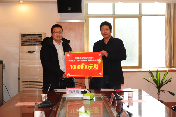 捐赠仪式上,武汉鑫荣成科技有限公司董事长阮光友向我校捐赠100万元。