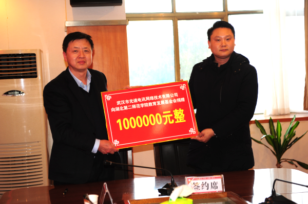 捐赠仪式上,武汉市光速电讯网络技术有限公司总经理龚磊向我校捐赠100万元。