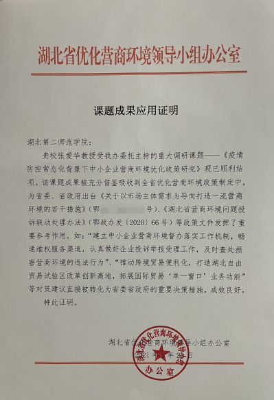 本网讯(通讯员 刘菲)近日,受湖北省优化营商环境领导小组办公室委托,由湖北省域治理现代化评价研究中心负责人、我校管理学院教授张爱华主持的省发改委重大调研课题《疫情防控常态化背景下中小企业营商环境优化政策研究》顺利结项。