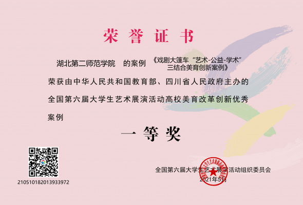 据悉,本次艺术节由教育部和四川省人民政府共同主办,全国198所高校,264支代表队,6800余名师生参加展演活动,其中有95个案例获评优秀,我校是湖北省推荐美育案例最多的高校,也是湖北省三个获奖优秀案例之一。(编辑 张震 供图 王培喜)
