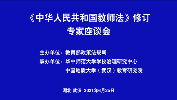 本网讯(通讯员 李菁)6月25日下午,由教育部政策法规司主办,华中师范大学学校治理研究中心、中国地质大学(武汉)教育研究院承办的《中华人民共和国教师法》修订专家研讨会在中国地质大学(武汉)举行。