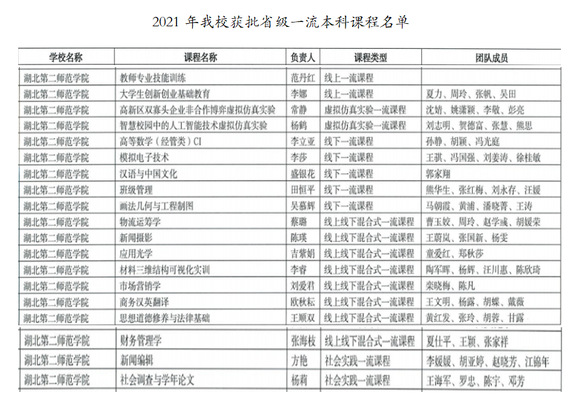 本网讯(通讯员 杜文娟)近日,湖北省教育厅公布了2021年度省级一流本科课程认定结果,我校《教师专业技能训练》等19门课程被认定为省级一流本科课程,其中,线上一流课程2门,线下一流课程5门,线上线下混合式一流课程8门,虚拟仿真实验一流课程2门,社会实践一流课程2门。