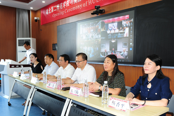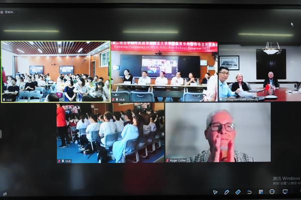 本网讯(通讯员 唐志强)9月16日,我校和美国东北州立大学在4号教学楼4203智慧教室联合举行学前教育中外合作项目线上开班典礼。美国东北州立大学校长史蒂夫•特纳(Steve Turner)、教育学院院长瓦内萨•安顿(Vanessa Anton)、国际部代理主任罗杰•科勒(Roger Collie)、国际部亚洲项目主管李晅,我校校长郑军、副校长夏力出席线上开班典礼。