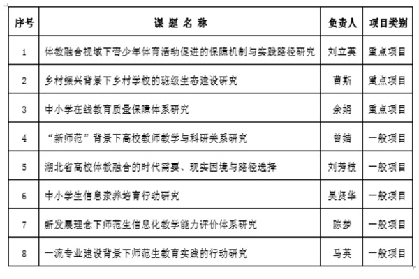 本网讯(通讯员 熊恺妮)近日,湖北省教育科学规划领导小组办公室公布了2021年度课题立项名单。我校获重点项目立项3项,一般项目立项5项,名单如下: