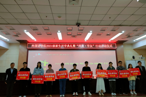典礼在庄严的国歌声中拉开序幕。外国语学院院长刘晖致辞,代表学院对2021级全体新生的到来表示欢迎,对校情校史、外国语学院各专业进行详细的介绍。2021级新生代表外国语言文学类1班王朝露同学发言。副院长欧秋耘宣读2021年“新生奖学金”获奖名单。两训中心常务副主任王勇,国际交流合作处、港澳台办公室副处长崔卿为“新生奖学金”获奖同学颁奖。