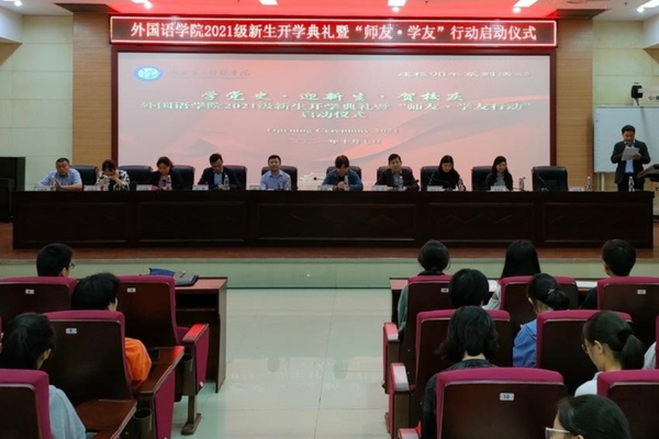 本网讯(通讯员 伍晓飞)10月7日晚,外国语学院在图书馆一号报告厅举行2021级新生开学典礼暨“师友·学友行动”启动仪式。校党委书记张国秀出席,外国语学院分党委副书记吴少明主持。