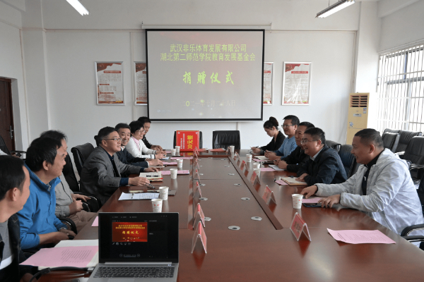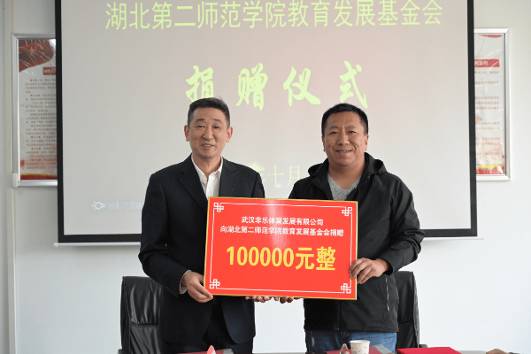 捐赠仪式上,武汉非乐体育发展有限公司向我校教育发展基金会捐赠10万元,基金会秘书长王正喜代表学校接受捐赠。