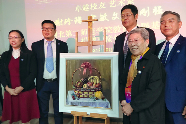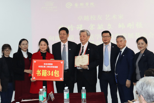 油画家、美术教育家谢珍珠,国家一级美术师余敏文,原国家教委艺术教育委员会委员、教育部全国中小学音乐教材审查委员会委员邱刚强教授等知名专家学者、卓越校友出席捐赠仪式并向学校捐赠了作品。谢珍珠教授捐赠油画《硕果累累》,余敏文教授捐赠中国画《赤地仙境可高攀》,邱刚强教授捐赠个人书籍34包。