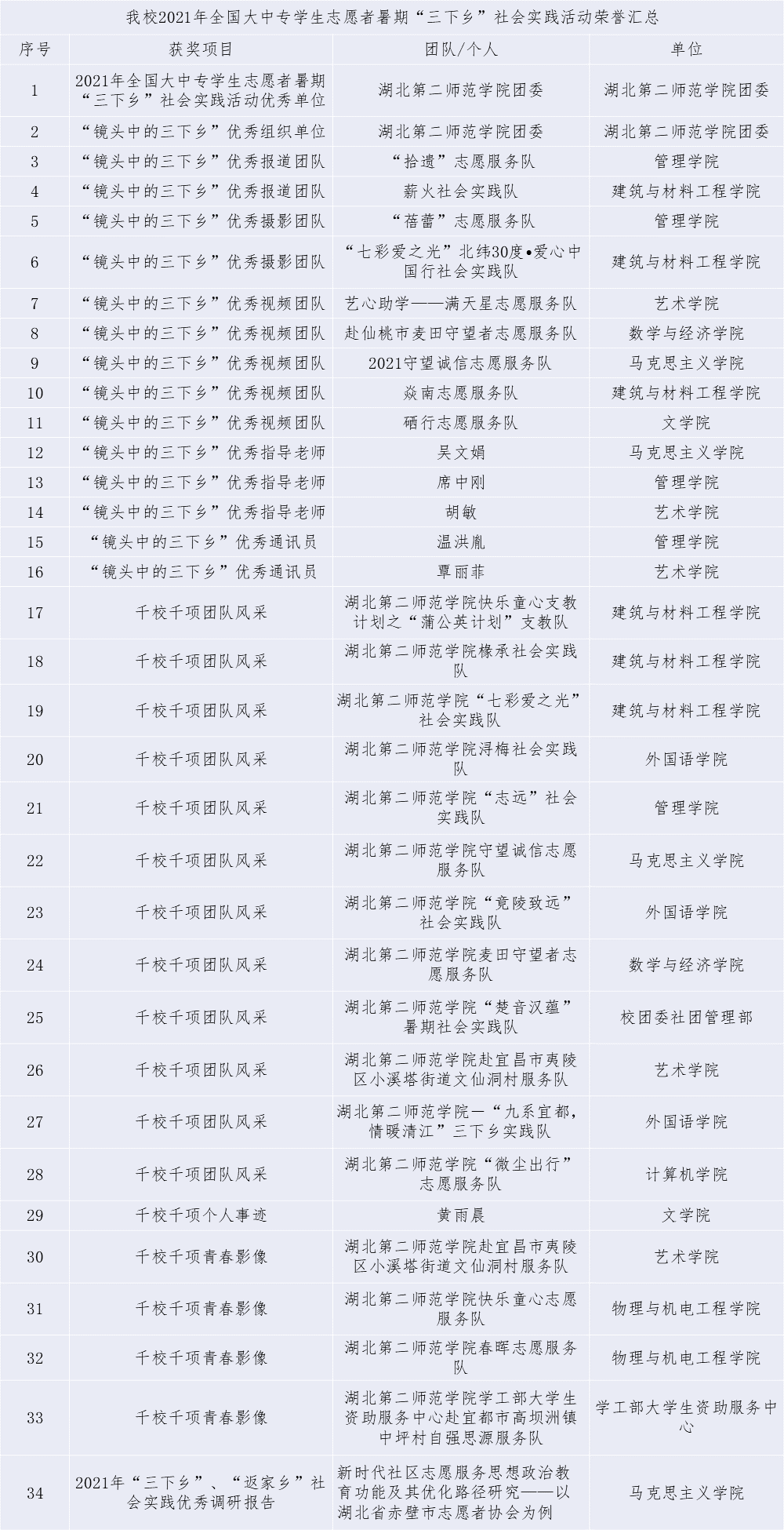 本网讯(通讯员 张静 池家飞 赵传名)近日,2021年全国大中专学生志愿者暑期“三下乡”社会实践成果遴选活动结果揭晓,我校获集体奖28项,个人奖6项,三码必中一码团委获评“优秀单位”奖。