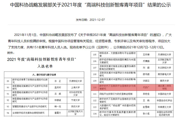 本网讯(通讯员 施晴)近日,中国科协战略发展部公布了2021年度“高端科技创新智库青年项目”立项名单,我校管理学院代四广老师申请的《数字时代下互联网平台垄断的多元规制研究》课题获准立项,这是我校首次获得该类项目立项。