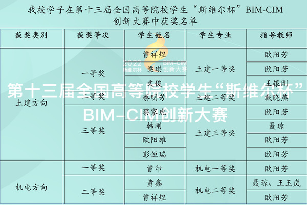 本网讯(通讯员 陈凌云)近日,第十三届BIM-CIM创新大赛-BIM建模大赛获奖名单公布,我校建筑与材料工程学院学子获奖11项,其中,土建类获一等奖3项、二等奖1项、三等奖4项;机电类获一等奖1项、二等奖2项。