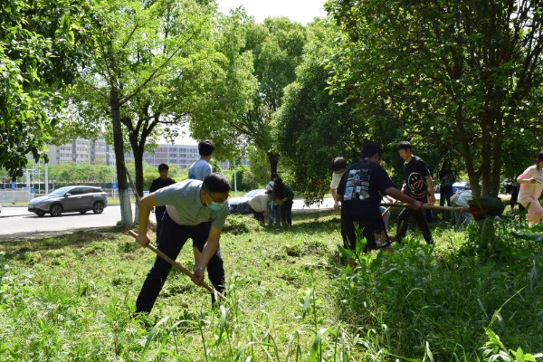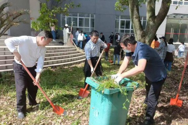 陈勇率文学院“师友·学友行动”联系部门老师与文学院师生一同捡拾垃圾、清扫树叶、清除杂草。