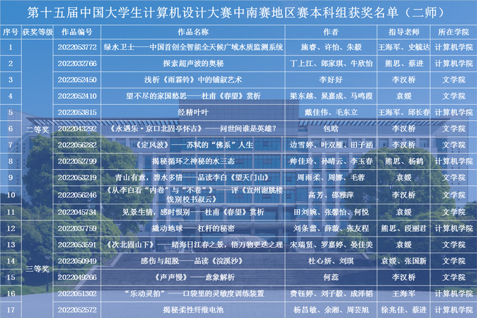 本次大赛于今年三月份正式启动。经过校赛选拔,计算机学院和文学院选送的18件作品进入中南地区赛。(编辑 张震)