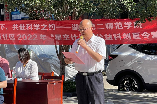仙女山街道主任金承虎致欢迎辞;金殿中向仙人位社区授牌“大学生社会实践基地”;文敏向“星空计划”公益科创夏令营授队服;汉川市团市委书记丁潮向“星空计划”公益科创夏令营授旗;与会领导向夏令营学员代表们发放开营物资。