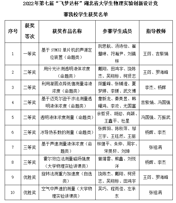 本网讯(通讯员 王筠)7月12日至13日,在武汉工程大学邮电与信息工程学院举办的第七届“飞梦达杯”湖北省大学生物理实验创新设计竞赛决赛中,我校物理与机电工程学院学子斩获得一等奖1项、二等奖4项、三等奖3项和优胜奖2项。
