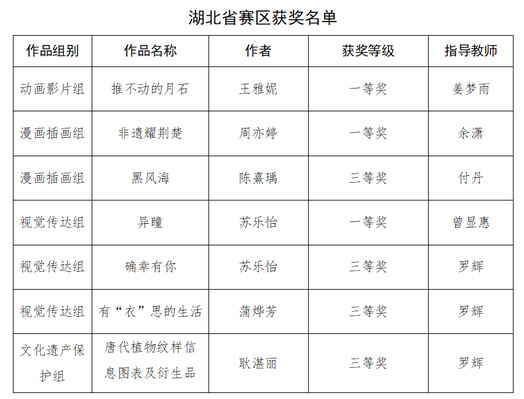 据悉,本届大赛分为视觉传达组、产品造型组、漫画插画组、空间设计组、文化遗产保护组、动画影片组、微电影影像组、数字媒体组等8个组别,湖北省赛区共收到62所高校提交的7593件参赛作品。(编辑 张震)