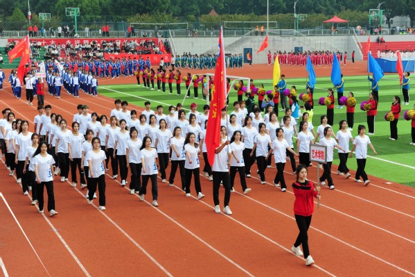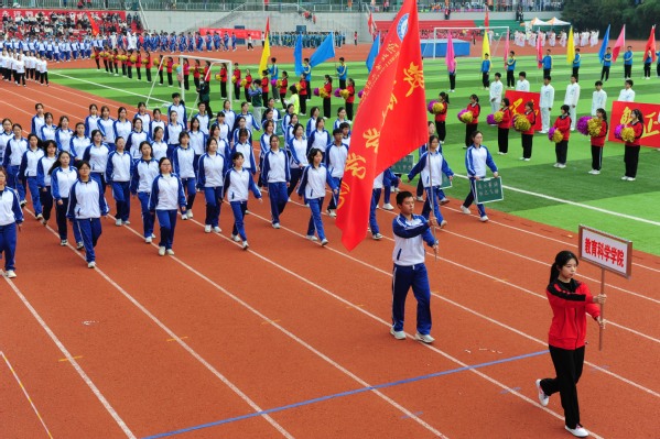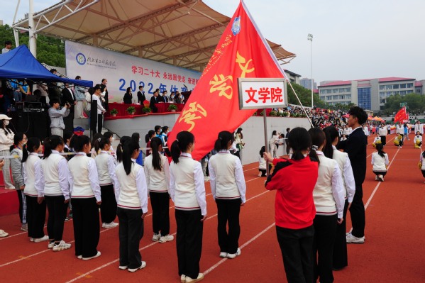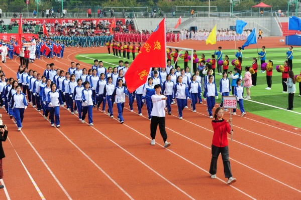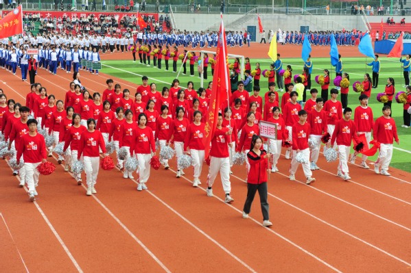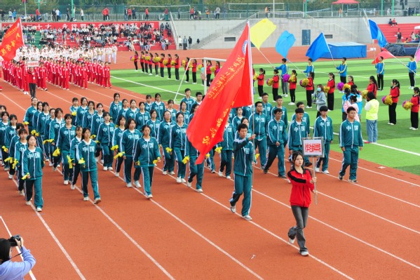在激昂《运动员进行曲》中,国旗队、校旗队、校训仪仗队、彩旗队、鲜花队、裁判员代表队和13个学院方阵代表队依次入场。朝气蓬勃,神采飞扬,彰显了我校师生良好的精神风貌。