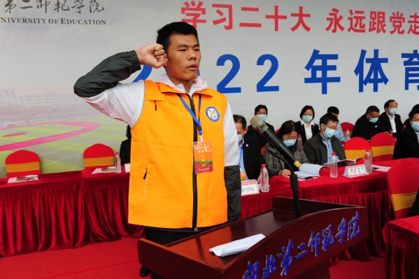 运动员代表物理与机电工程学院杨新召同学、裁判员代表体育学院张梓俊同学分别宣誓。