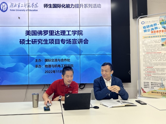 本网讯(通讯员 王俊娇 王骐)11月4日晚,由国际交流与合作处主办、物理与机电工程学院承办的我校2023年度“美国佛罗里达理工学院硕士研究生项目”专场宣讲会通过抖音直播拉开帷幕,直播会场设在物理与机电工程学院会议室,由国际交流与合作处副处长崔卿和物理与机电工程学院中外合作办学项目部负责人王骐共同主持。