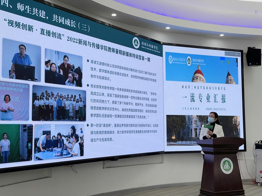 新闻与传播学院副院长陈欣从学院的初建与愿景、一流专业建设举措与实践、学生成长助推工程实效三个方面对新闻学专业建设发展做阶段性总结汇报。新闻学于2019年获批教育部首批国家级一流本科专业建设点,致力于服务新时代基层新闻宣传,培养“讲政治、懂国情、有本领、接地气”,具有马克思主义新闻观和家国情怀的复合应用型人才,坚持践行马克思主义新闻观,坚持立德树人,融合学科、融合行业、融合技术,立足中国光谷区域优势,精准定位城市社区+县域融媒体传播人才需求,全方位立体打造育人平台,实现变轨超越、错位发展,为服务区域经济社会发展贡献自己的力量。