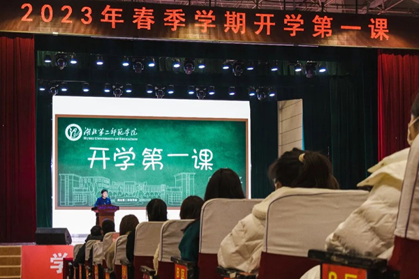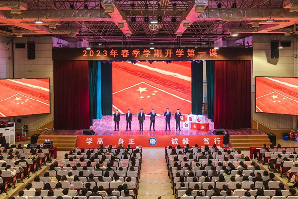 本网讯(新闻中心记者 程丽鹃)2月20日晚,学校“强信心、创未来”开学第一课在大礼堂开讲。校党委书记杨鲜兰、校长郑军带头上开学第一课,学生代表、家长代表,副校长黄颂、夏力,校党委常委宣传部长周忠,相关部门主要负责人,各教学学院院长、党委(党总支)书记、辅导员、教师代表现场听课。全校同步在各教学学院设立直播分会场。