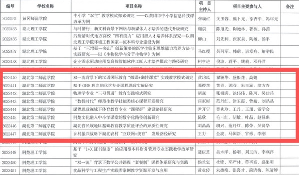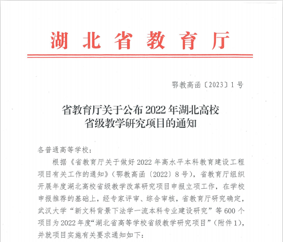 本网讯(通讯员 李茜)近日,湖北省教育厅发布了《省教育厅关于公布2022年湖北高校省级教学研究项目的通知》(鄂教高函〔2023〕1号),学校8个项目获批省级教学研究项目立项。
