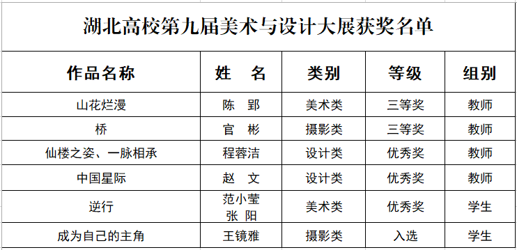 本网讯(通讯员 陈思)近日,从湖北省文化和旅游厅获悉,湖北省高校第九届美术与设计大展获奖名单公布,我校艺术学院师生在众多创作作品中获得佳奖。