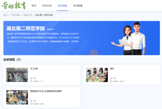 本网讯(通讯员 杨帆)近日,我校美育实践中心三门美育劳动课程入选教育部大中小学劳动教育公益性资源,在国家智慧教育公共服务平台劳动教育专区上线。