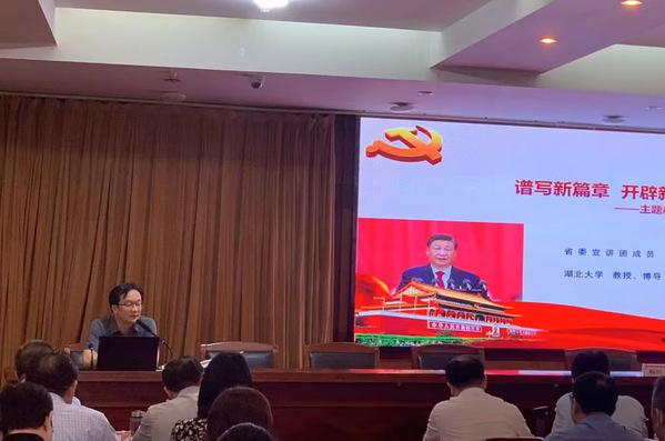 熊友华以《谱写新篇章开辟新境界》为题,从“马克思主义必须中国化时代化”“谱写马克思主义中国化时代化的新篇章”“推进马克思主义中国化时代化的六原则”“开辟马克思主义中国化时代化的新境界”四个方面,围绕“马克思主义为什么一定要中国化?”“马克思主义为什么行?”“如何推进马克思主义中国化时代化?”等对马克思主义中国化时代化进行详细阐释。报告强调,中国共产党必须把握好习近平新时代中国特色社会主义思想的世界观和方法论,坚持好、运用好贯穿其中的立场观点方法,全面系统地学习掌握“十个明确”、“十四个坚持”和“十三个方面成就”,在“六个坚持”中继续推进实践基础上的理论创新,在坚持“两个结合”中继续验证和推进“两个行”,不断谱写马克思主义中国化时代化新篇章,开辟马克思主义中国化时代化新境界。