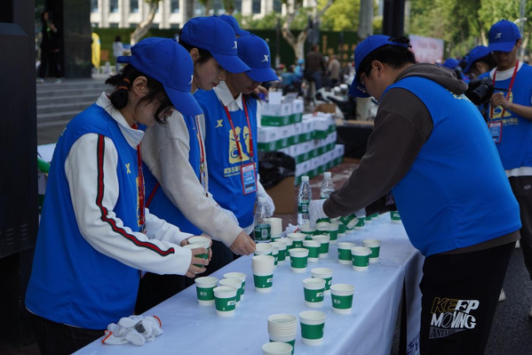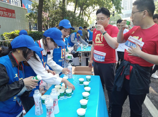 当参赛选手们跑进补给站后,志愿者们迅速补充物资,忙碌中充满着幸福。7.5公里处用水站志愿者唐雅茹说:“我一边为参赛选手们不停地补给物资,一边不停地为他们竭力呼喊,加油助力,他们不停地对我们说谢谢、对我们微笑、招手、还和我们击掌,很幸运参与此次志愿服务,这堂社会实践课让我备受鼓舞。”