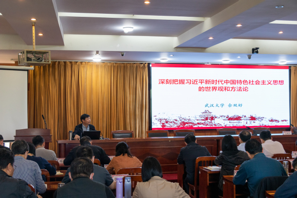 佘双好以《深刻把握习近平新时代中国特色社会主义思想的世界观和方法论》为题,从“新思想对世界观和方法论的继承和发展”“新思想世界观、方法论和立场观点方法关系”“新思想世界观和方法论精髓要义和基本要求”“牢牢把握新思想的世界观和方法论”四个方面,对习近平新时代中国特色社会主义思想的世界观和方法论进行了全面梳理和系统阐述,以及如何深刻理解掌握新思想世界观和方法论提出建议和方法。他表示,要学习把握新思想的世界观和方法论,首先要树立科学的马克思主义观,要按照习近平新时代中国特色社会主义世界观的根本要求,身体力行,不断优化自己的人生观、价值观、实践观,增强历史主动性,肩负起当代中国共产党人的庄严的历史使命。