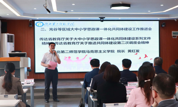 会上,作为湖北省大中小学思想课一体化共同体建设牵头示范高校负责人,黄红发传达了省教育厅系列文件和相关会议精神,介绍了光谷等区域一体化共同体建设有关情况。教师教育学院院长王勇宣读了《省委教育工委省教育厅关于公布大中小一体化共同体建设综合改革试点单位的通知》。