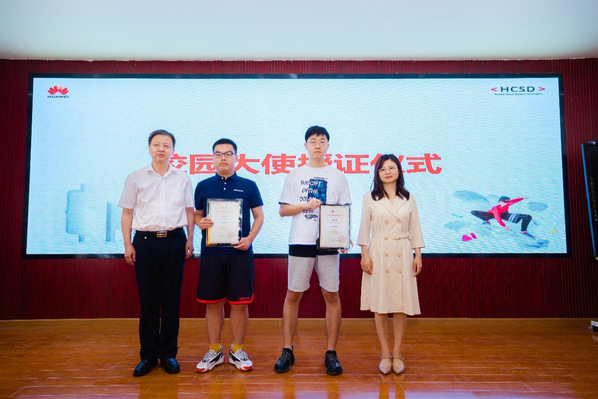 活动现场,22级计算机科学与技术专业翁佳航、20级计算机科学与技术专业吴汉钦当选为三码必中一码华为云校园大使,胡兴、范林芳为优秀的校园大使颁发证书。