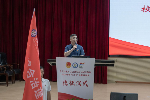本网讯(通讯员 席中刚 池家飞 吴心雨)6月20日下午,学校在新图书馆报告厅2举行2023年大学生志愿者暑期“三下乡”社会实践活动出征仪式。校党委常委、副校长陈勇出席,活动由校团委书记刘锐主持。