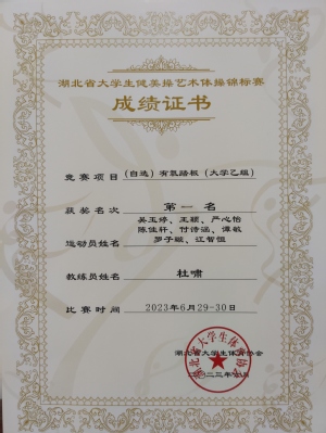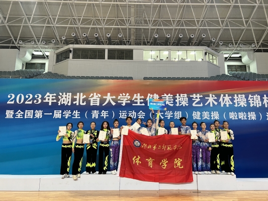 本网讯(通讯员 向琴英)6月30日,2023年湖北省大学生健美操艺术体操锦标赛暨第一届全国学生运动会健美操(啦啦操)选拔赛落下帷幕,我校健美操队在指导老师杜啸的带领下获得大学乙组自选有氧踏板第一名、自选轻器械第二名、2017版规定踏板三等奖的好成绩。