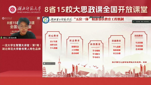 本网讯(通讯员 陈申昊)8月1日,我校外国语学院21级英语(师范)本科专业4班陈申昊同学参加了“一流大学生智慧大讲堂”大思政课全国开放课堂,并作主旨演讲。本次活动以“实践服务社会,行动谱写青春”为主题,邀请湖北、湖南、广东、山东、浙江、江苏、辽宁、吉林等8省15校携手共研共建大思政课全国开放课程。