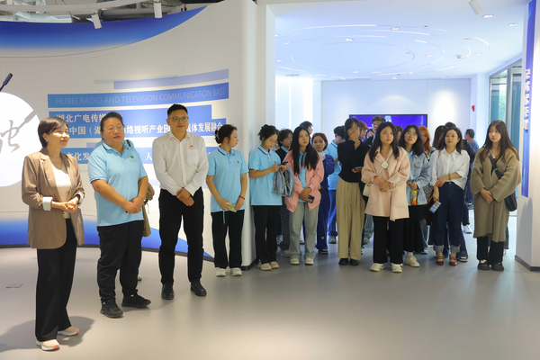 实践活动的第一站是前往湖北长江文创产业园参观。湖北长江文创产业园是中部地区第一个国家级广播影视内容媒体基地。首批入驻长江文创产业园的企业既有穆特科技、高投工坊、光合传媒等独角兽、小巨人、瞪羚等发展型企业,也有光谷融媒体中心、光谷瞪羚企业服务中心、湖北省数字技术研究和试验发展协会等产业服务平台。师生们认真聆听解说员的介绍,参观汇聚企业的特色产品与应用场景,感受数字媒体交互艺术的沉浸式体验,将专业知识与实践活动相结合,感受网络新媒体的加速发展对我们的行为方式、思维观念产生影响,加深对所学专业的认识。