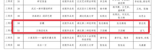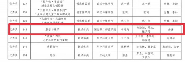 本网讯(通讯员 胡语馨)近日,2023年湖北省大学生文化创意作品大赛结果正式出炉。我校荣获两个三等奖,一个优秀奖,学校获“优秀组织奖”。其中由雷宏亮老师指导作品《苗疆》,谈飞老师指导作品《文物活起来》获三等奖 , 余潇老师指导作品《胖子与瘦子》获优秀奖。