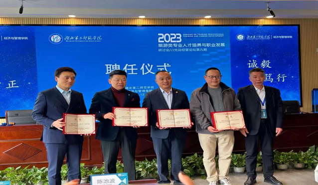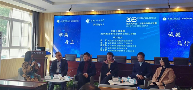 我校财务处处长王诗龙主持大会主题报告。武汉商学院旅游管理学院院长薛兵旺教授全面介绍了高星级酒店人力资源的结构状况,并向同学们提出了期望;湖北大学文旅产业发展研究中心主任胡芬教授从产教融合的角度探索了应用型人才特色培养的新路径;武汉市旅游学校旅游专业名师工作室主持人陈波教授介绍了中职学校旅游类专业教师的需求现状,剖析了旅游类专业教师任职能力要求及培养路径;武汉东湖濮锦酒店总经理、我校07级酒店管理专业校友王锋分享了自身的酒店职业发展经历,勉励同学们牢记初心、矢志不渝,开创自己的精彩人生。