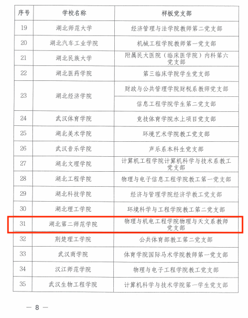 本网讯(通讯员 伍明)近日,湖北省委教育工委发布《省委教育工委关于公布首批全省高校基层党建示范创建工作验收通过名单的通知》(鄂教工委函〔2023〕23号),我校计算机学院党委通过省级首批“标杆院系”创建验收,物理与机电工程学院物理与天文系教师党支部和武昌职业学院教学第一党支部通过省级首批“样板支部”创建验收。