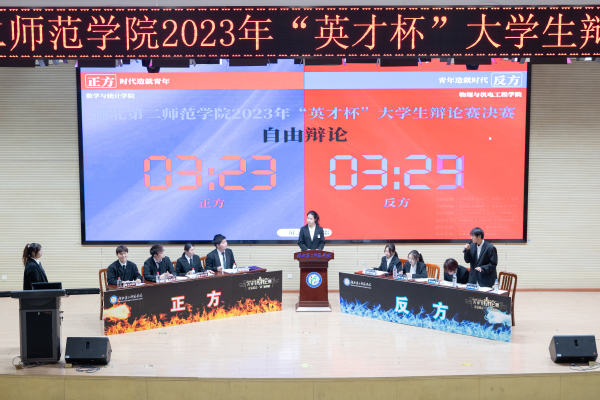 进入决赛的数学与统计学院和物理与机电工程学院代表队围绕“时代造就青年/青年造就时代”展开了激烈辩论。双方多次正面交锋将比赛推向高潮,赢得观众阵阵掌声。物理与机电工程学院代表队用号召式结辩点燃了在场观众们的热情,数学与统计学院代表队则用十个“恰恰”结辩,巧妙扣题,在严谨细致的同时又不乏幽默风趣。