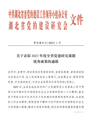 本网讯(通讯员 卢郅睿)近日,中共湖北省委党的建设工作领导小组办公室、湖北省党的建设研究会发布《关于表彰2023年度全省党建研究课题优秀成果的通报》(鄂党建办文〔2024〕1号),我校文学院课题组《新时代高校党建引领师德师风建设的发展策略》获评2023年度全省党建研究课题优秀奖。
