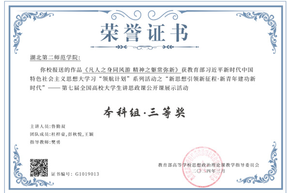 本网讯(通讯员 鲁勤双)近日,由教育部高校思想政治理论课教学指导委员会主办的“新思想引领新征程·新青年建功新时代”——第七届全国高校大学生讲思政课公开课展示活动评选结果揭晓,马克思主义学院鲁勤双等同学主讲的思政课作品《凡人之身同风游精神之躯常弥新》荣获本科组全国三等奖,这是我校首次在该项比赛中获奖。