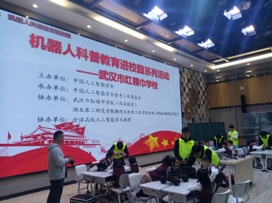 本网讯(通讯员 邓陕丽)4月7日,由中国人工智能学会主办,我校机器人STEAM教育研究所协办的“机器人科普教育进校园系列活动——武汉市红领巾学校”科普活动在汉举行。物理与机电工程学院(以下简称“物机学院”)教师万振武和7名学生组成的科技志愿者团队,作为活动的主讲老师及助教到武汉市红领巾学校(尚美校区)进行科普讲解与展示。