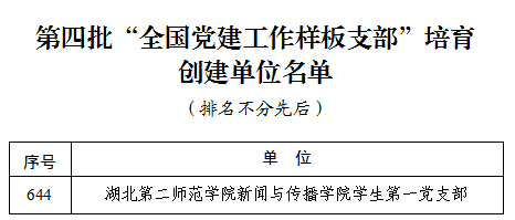 本网讯(通讯员 伍明)近日,教育部办公厅公布了第四批全国党建工作示范高校、标杆院系、样板支部培育创建单位名单,我校新闻与传播学院学生第一党支部入选“全国党建工作样板支部”。