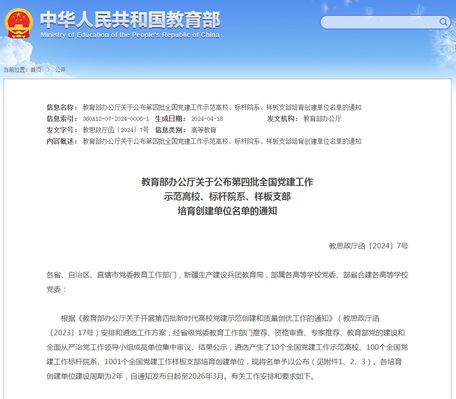 据悉,本次共遴选10个全国党建工作示范高校、100个全国党建工作标杆院系、1001个全国党建工作样板支部培育创建单位。(新闻中心编辑 程丽鹃)