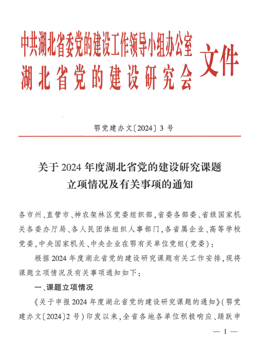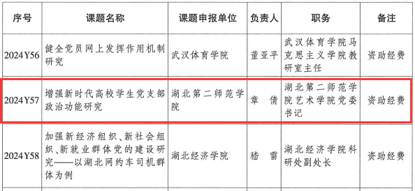 本网讯(通讯员 伍明)近日,中共湖北省委党的建设工作领导小组办公室、湖北省党的建设研究会公布了湖北省2024年度党建研究立项课题名单,我校艺术学院党委书记章倩负责的《增强新时代高校学生党支部政治功能研究》获得专项课题立项。